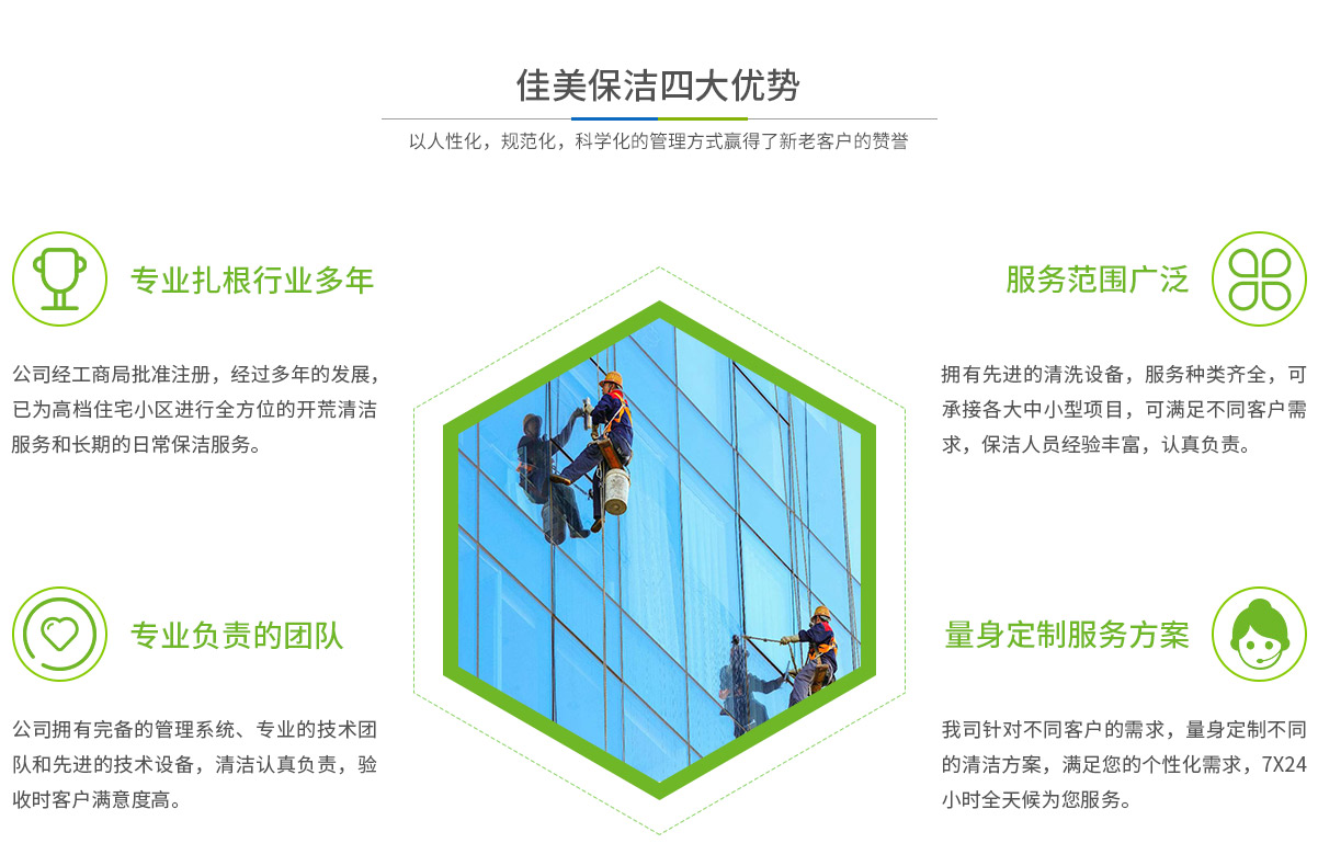 - 馬鞍山市佳美保潔服務(wù)有限公司是一家經(jīng)工商部門批準(zhǔn),具有法人資格專業(yè)清洗,馬鞍山保潔服務(wù)的公司,自創(chuàng)辦以來,一直致力于企業(yè),家庭,賓館,學(xué)校,別墅,酒店,商廈,公共設(shè)施等場所提供科學(xué)的日常保潔和清潔保護的服務(wù)公司,有著豐富的管理服務(wù)和保潔經(jīng)驗...